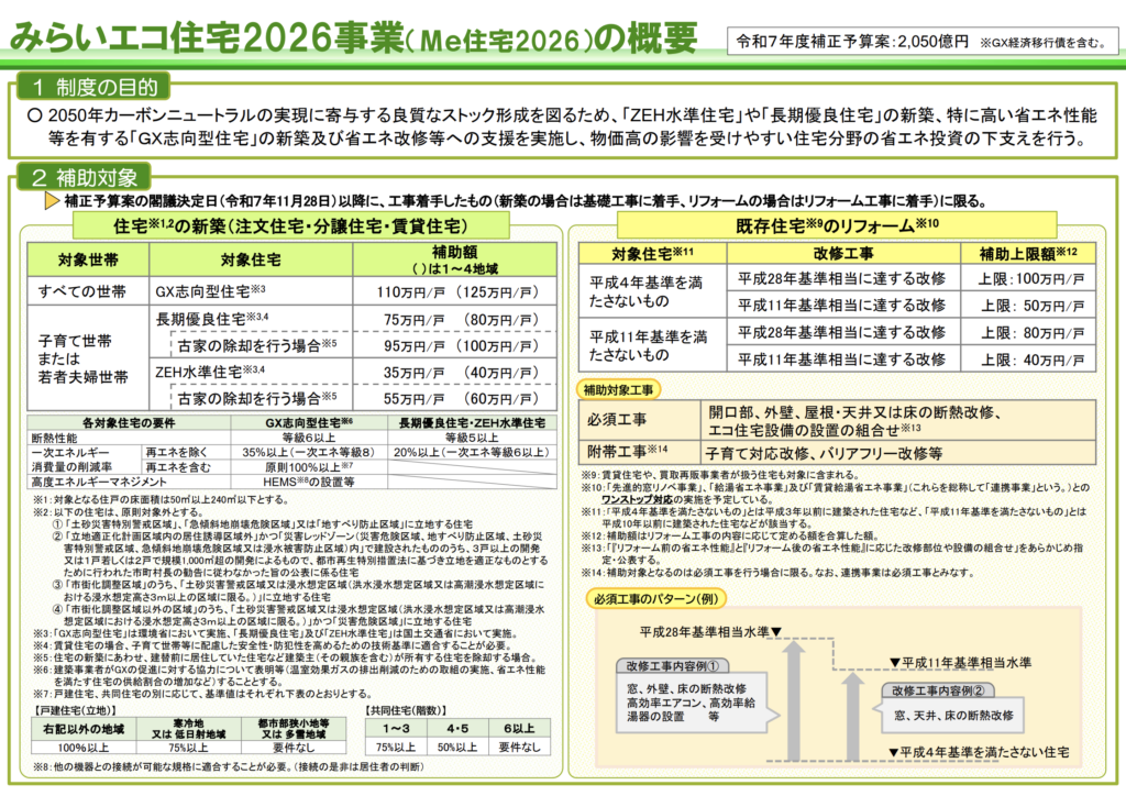 2025年11月28日に発表された、新しい住宅補助制度「みらいエコ住宅2026」。